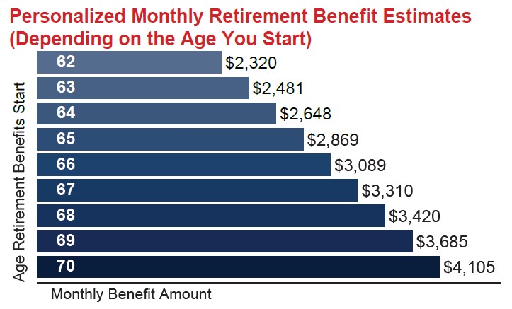 Here’s where a little bit of math helps, and fortunately, the Social Security Administration has done some of the work for you – download your Social Security Statement, and it will show you a “Personalized Monthly Retirement Benefit Estimates.”