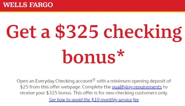 Yes, Wells Fargo will give you $325 because they’re trying to get new customers and this welcome bonus is a nice little carrot. This is one of the simplest bonuses to get and you only need to open it with $25 and receive a total of $1,000 or more in qualifying direct deposits into the new checking account within 90 days from account opening.
