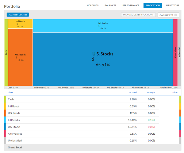 It's hard to see your asset allocation across brokerage accounts. But at a glance I know I'm 65.61% in U.S. stocks and 12.5% in U.S. bonds.