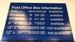 There’s a little sign above the bank of PO boxes listing availability as well as price.