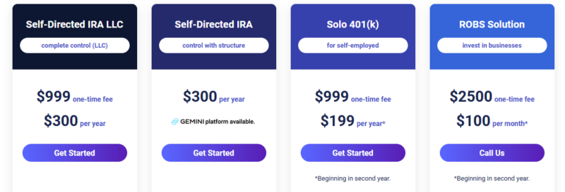 The Gold plan comes with all the features of the Core plan but also adds expedited service and transfers, four free yearly wire transfers, an account debit card, a custom named LLC, priority support, tax filing for the 1099-R and IRS Form 5500, and Roth IRA conversion assistance if needed. The fees for each plan are listed below.
