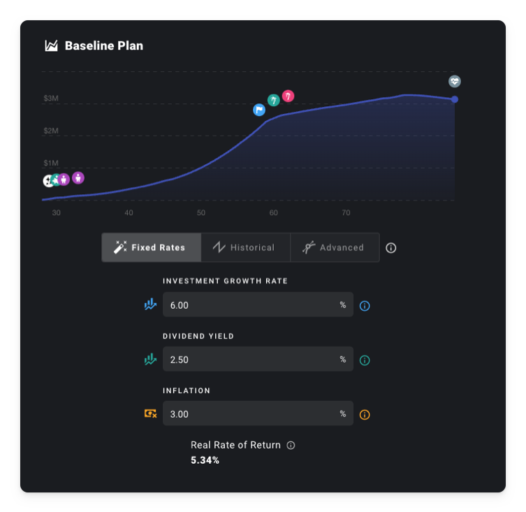 To make projections for the future, we will create a plan, define a few assumptions, add milestones, income streams, expenses, and cash-flow priorities, pick a tax configuration, and choose a drawdown sequence.