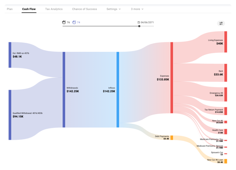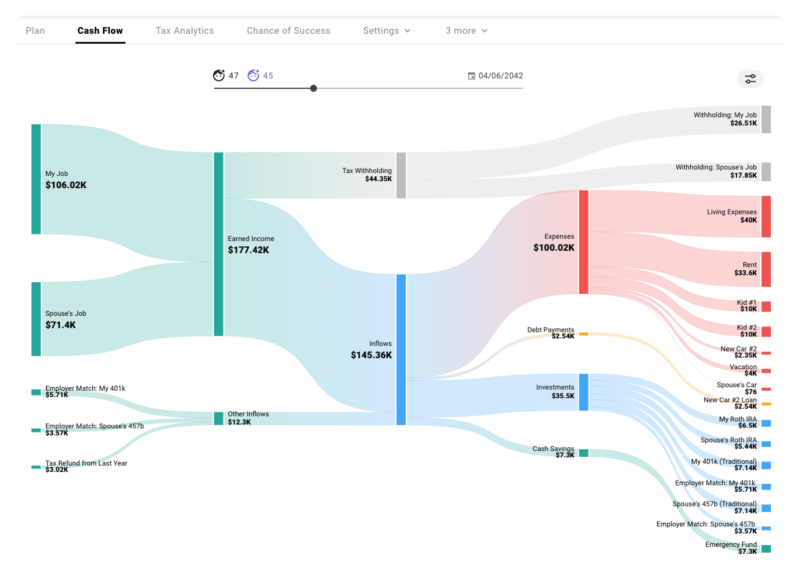 So, what is actually happening in some of these years? The sankey chart in the Cash Flow tab illustrates how money flows in and out during each simulated year.