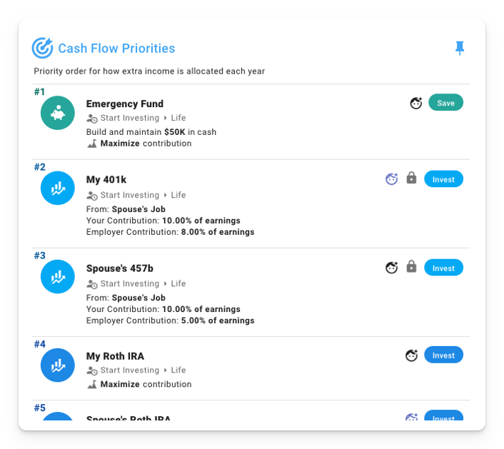 We can see how earned income (less withholding) flows into the plan, along with employer match/contributions to tax-advantaged accounts, and how these inflows are used to pay for expenses, service debt, contribute towards investments, and build an emergency fund based on our ordered cash flow priorities.
