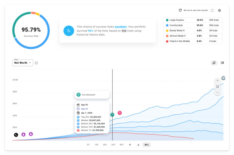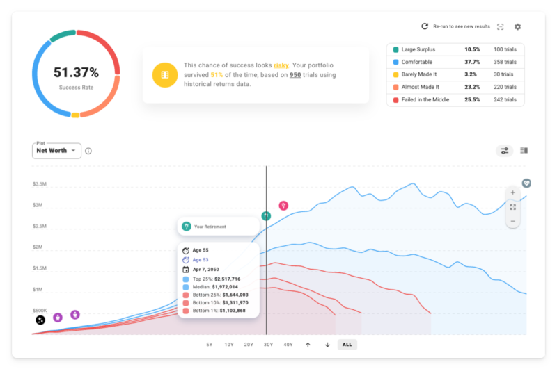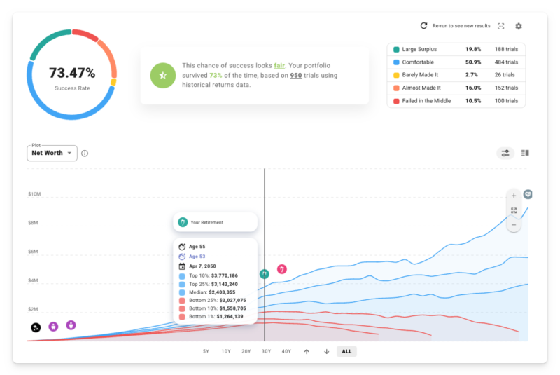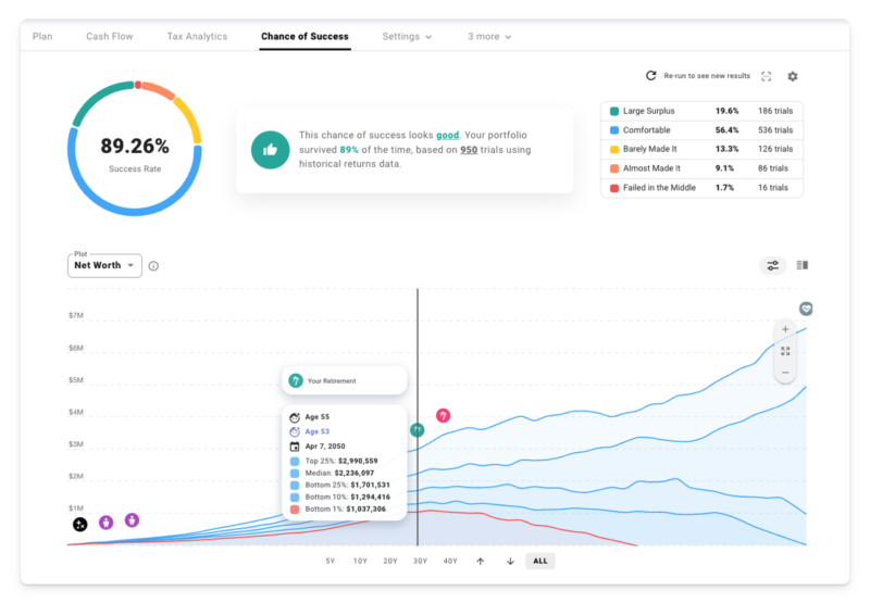 But what if we really want to battle-test this plan against the kind of market volatility you can expect in the real world? What if we want better intuition about the spectrum of possible outcomes? Time to visit the Chance of Success tab and run some Monte Carlo simulations!