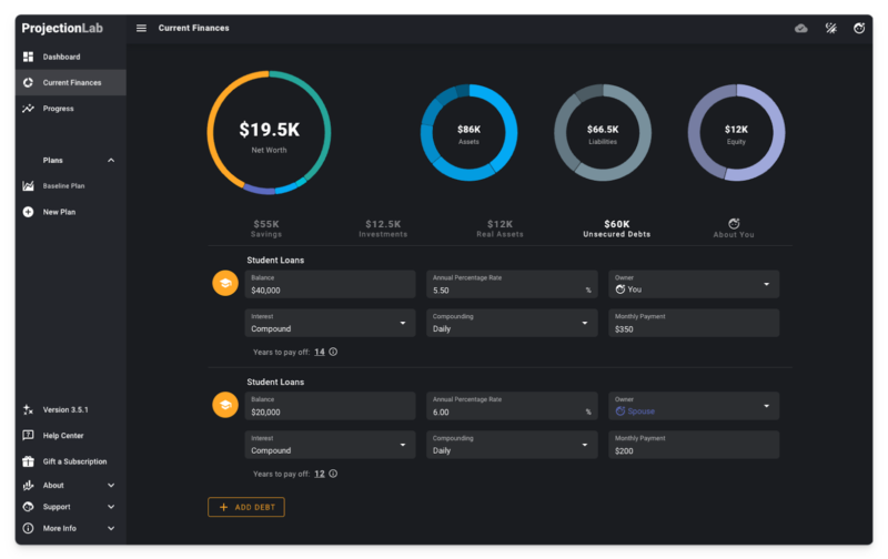 Within the Current Finances page, here is what we’ll start with. Some cash savings, two vehicles, a couple small investments, and student loans. I will also take the liberty to point out that there is a dark mode, if you are into that 😎