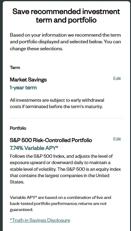 I went with the Save Global Multi-Strategy Portfolio anyway – it’s $1,000 and my principal is protected. I might as well go for a bit of a ride, right? (the current 12-month CD rate is 5.51% APY)