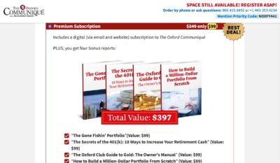 - Premium Subscription ($99 per year): A digital subscription plus access to four bonus reports (Gone Fishin’ Portfolio, Secrets of the 401(k), Oxford Club Guide to Gold, How to Build a Million-Dollar Portfolio from Scratch”).