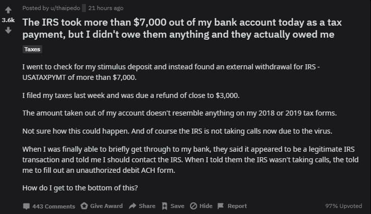 The gist is that u/thaipedo had $7,000 withdrawn from his account by the IRS, except he didn’t owe the IRS anything. He was due a refund!
