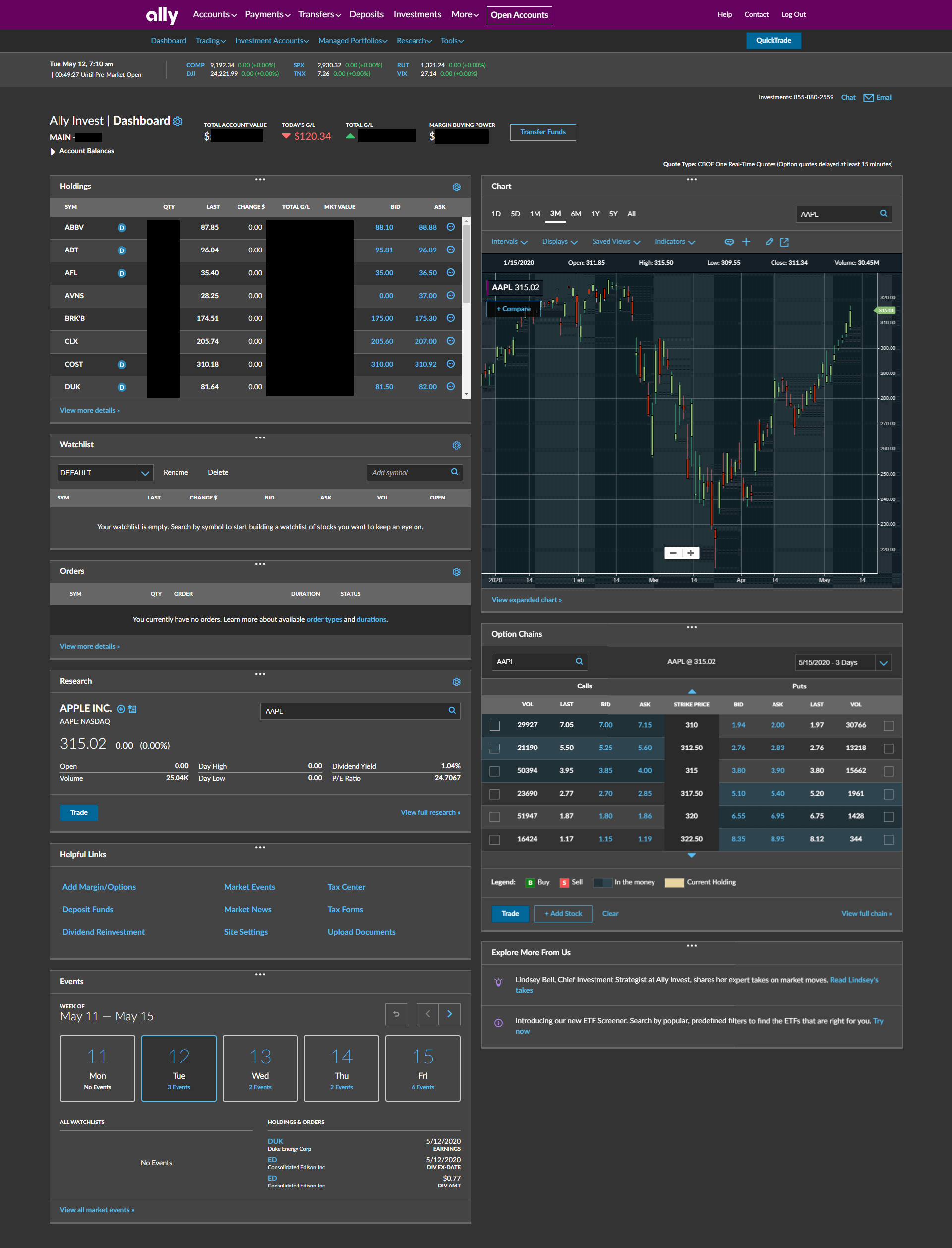 Here’s a shot of the top of the default dashboard (they call it Ally Invest Live, click to expand):