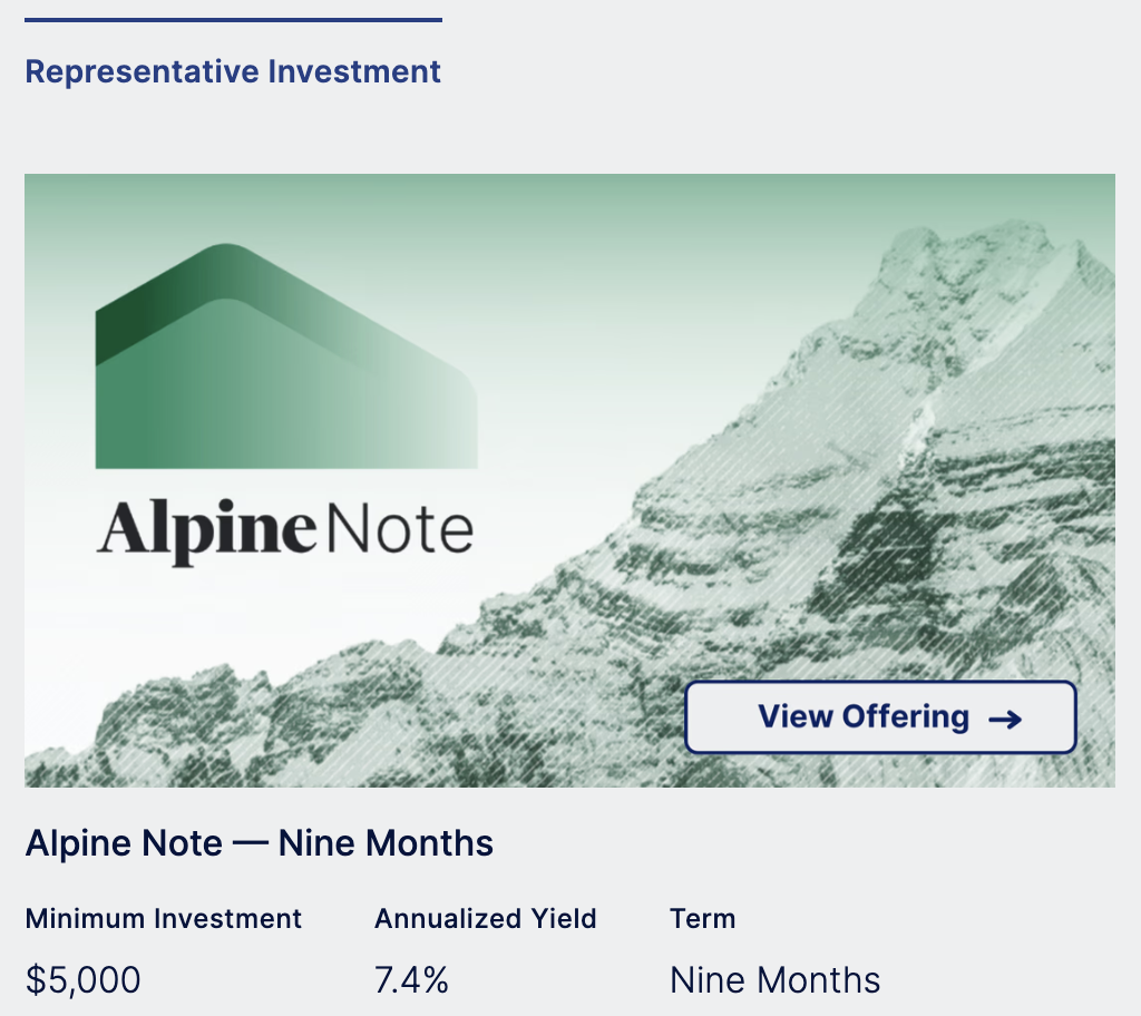 It’s available in terms of three months, six months, and nine months. Proceeds from Alpine Notes can be rolled into the subsequent series of another security or other EquityMultiple investments. As well, Alpine Note holders can redeem early (after 30 days) penalty-free to invest in another EquityMultiple offering.