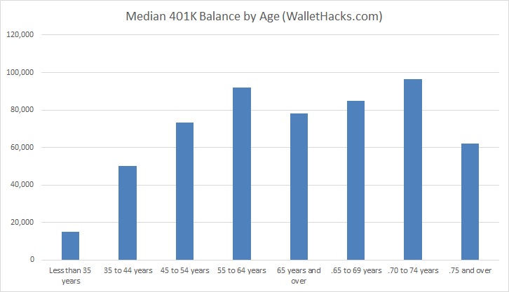 If we want to know the average 401(k) savings by age, we can look to Census data. When we say “average,” we (and what matters most to people) specifically refer to the term median. The middle of the pack, not necessarily the average… as they say, Bill Gates can turn a room of paupers into average millionaires.