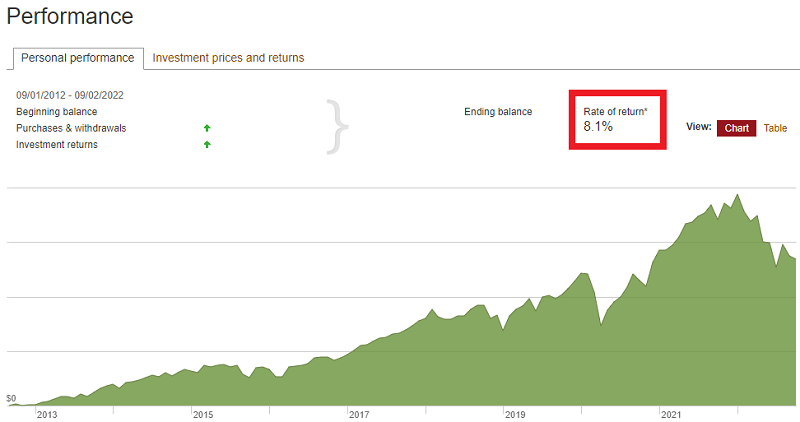 I made my first Roth IRA contribution in high school, at the urging of my father. On less than $20,000 of contributions over the last 20 years (it’s almost all front-loaded, but everyone should be saving more and more often), it’s grown to nearly over $145,000. The rate of return from 2012 (Vanguard only lets you look back 10 years) until now is over 25% a year. (this rate of return atypical – it’s largely holding shares of Apple)