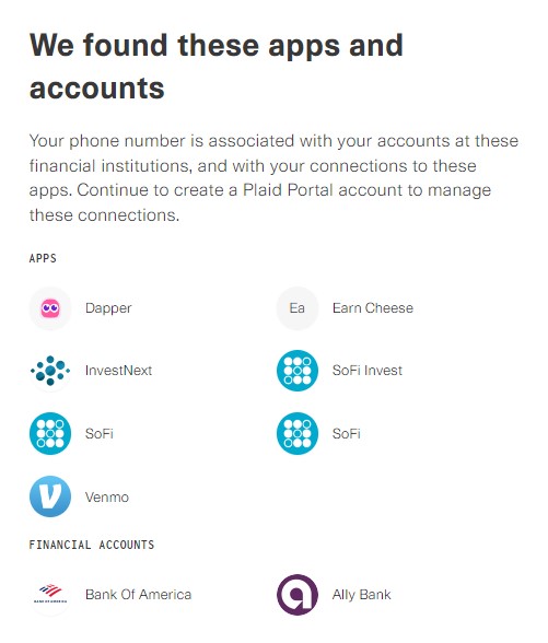 You can create a free Plaid Portal account by entering your phone number. This initial step lets you see which services are currently connected to your bank or PayPal accounts: