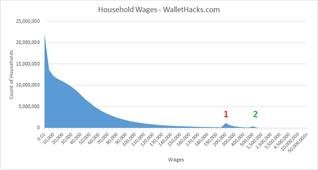 The hitches at $250k & $500k are likely due to dual income households that are high earners /professionals. My wife & I fall in that category. We both make over $120k. Some cities have a lot of these dual earners, such as NYC & San Francisco.
