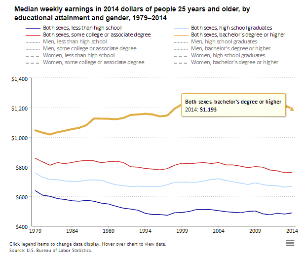 It is important to remember that these income studies are very general in nature. They never take into consideration the individual person’s intelligence and initiative. For example, what it takes just to search for job openings, figuring out the application process, how to sell yourself with a resume, having modern day computer and communication skills, and the need to make personal sacrifices such as relocating. Believe me, there are many examples of employees in state and federal government (me as one of them) who have bachelor’s degrees and more than 15 years of experience who earn LESS than high school graduates, especially if the HS graduates got hired way back when in a union position and are now a manager who has power over you and who is insecure around college grads! This also happens in the private sector, but not as often. Having said all that, I am still better off financially now than if would have just graduated HS and refused to relocate.