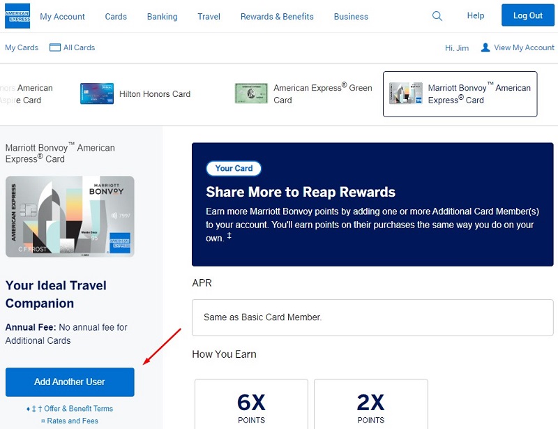 When I log into my American Express account, I see a big blue Add Another User right on the dashboard for my Marriott Bonvoy American Express Card: