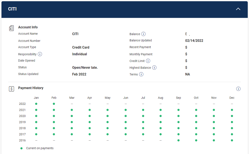 A lot of green dots – but no indication of how many payments were made. Open/Never late is the important part.