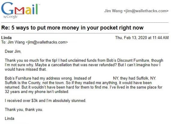 Heck, here’s an email I got from Linda where she was owed over $3,000 from Bob’s Discount Furniture!
