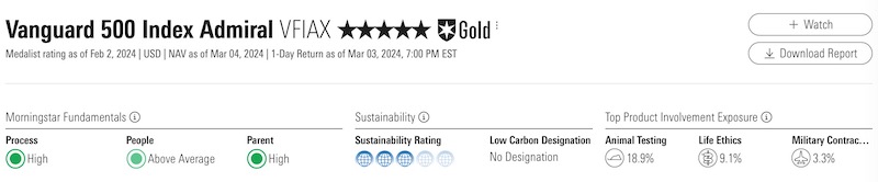 I took a look at the report for the Vanguard 500 Index Admiral Shares (VFIAX), which got 5 stars and a Gold rating as of March 4th, 2024. Remember, one of the rating criteria is Price and this report is based on the March 4th, 2024 price.