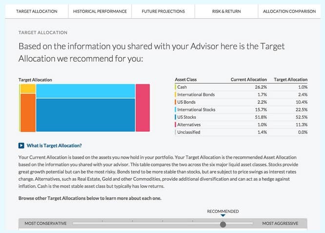 But the star of the Empower Personal Dashboard free investment service is the Investment Checkup tool. It works by comparing your current portfolio allocation with the target allocation to meet your financial goals. Though they don’t do any review of the risk in your portfolio, they make suggestions to achieve comparable levels of performance while reducing risk.