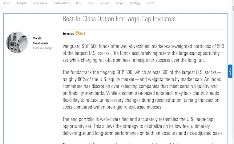The analysis of a fund includes a summary, followed by a look at the fund’s Process, People, Parent, Performance, and Price. The Process section for an index fund isn’t that interesting, as it just tracks the index, but it was interesting to read the People as they discuss the fund managers.
