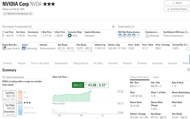 The Business and Strategy Outlook, dated February 21st, 2024, is also written by Colello, but it puts everything in context so you can understand the why behind a company. Why does Nvidia do well? “Nvidia has a wide economic moat, thanks to its market leadership in graphics processing units, or GPUs, hardware and software tools needed to enable the exponentially growing market around artificial intelligence. In the long run, we expect tech titans to strive to find second-sources or in-house solutions to diversify away from Nvidia in AI, but most likely, these efforts will chip away at, but not supplant, Nvidia’s AI dominance.”